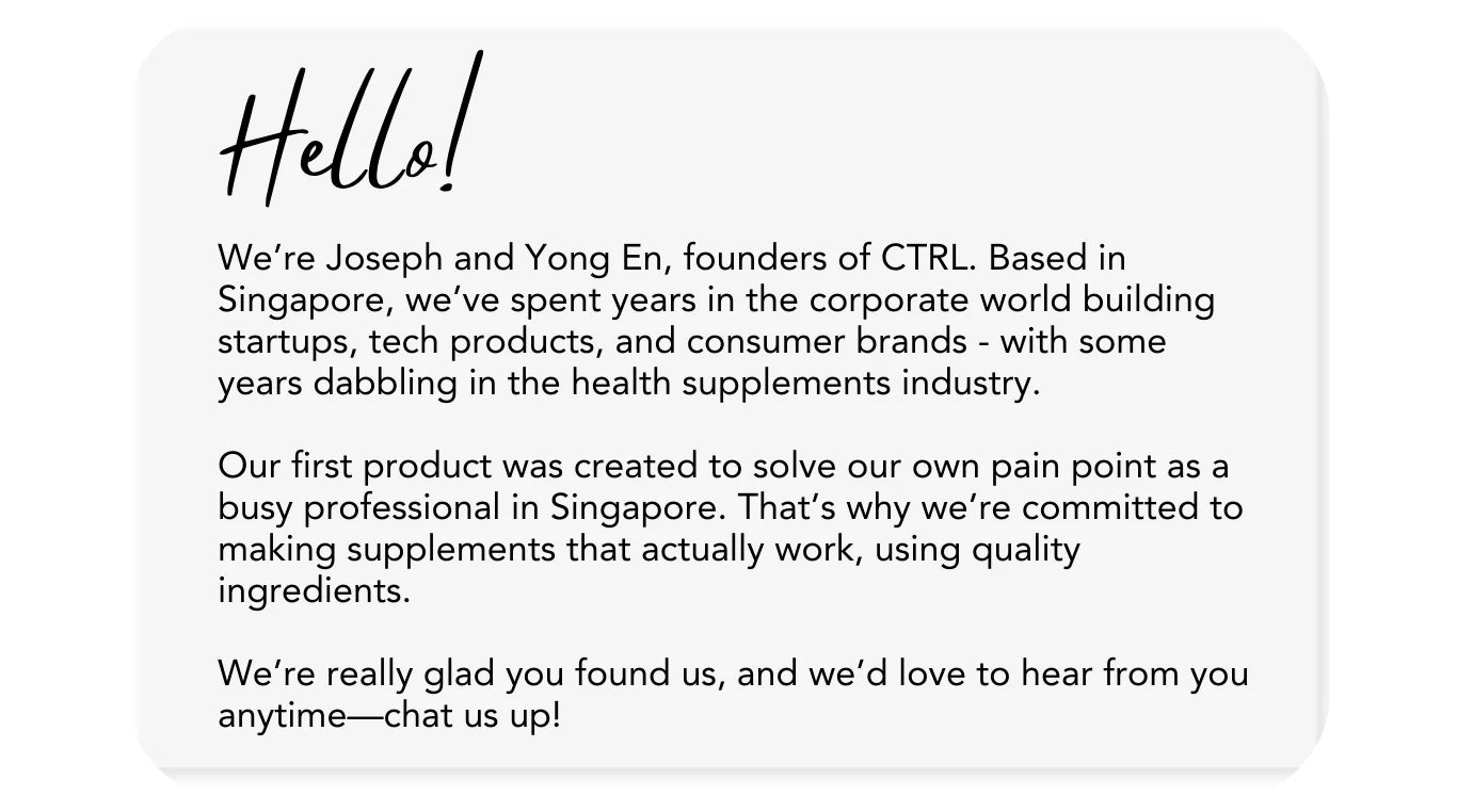 We’ve tried our fair share of supplements over the years—some were great, others fell short. With CTRL, our goal is to create the supplements we’d want for ourselves: ones that truly work, so you can feel confident in what you’re paying for and experience real effects in your daily life.